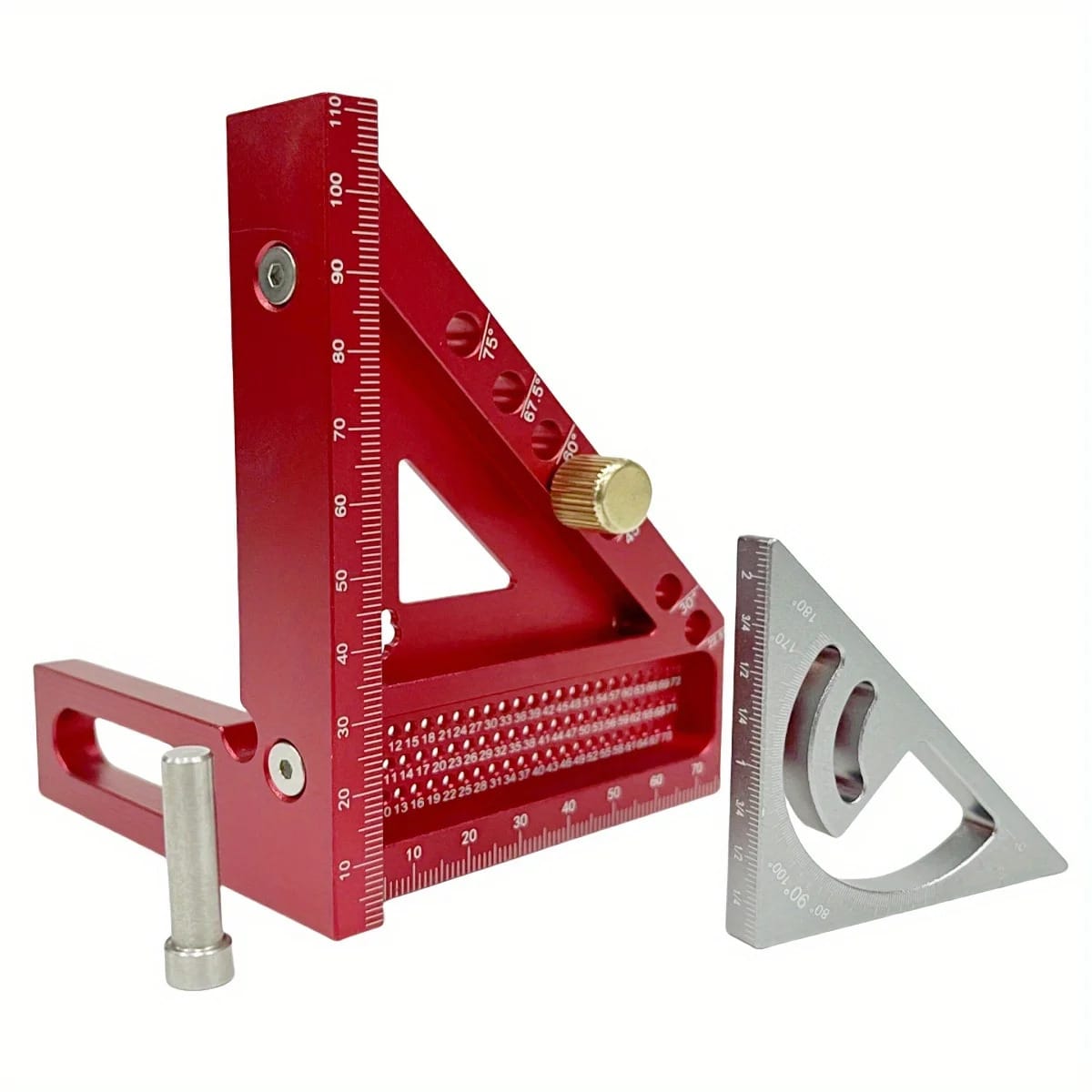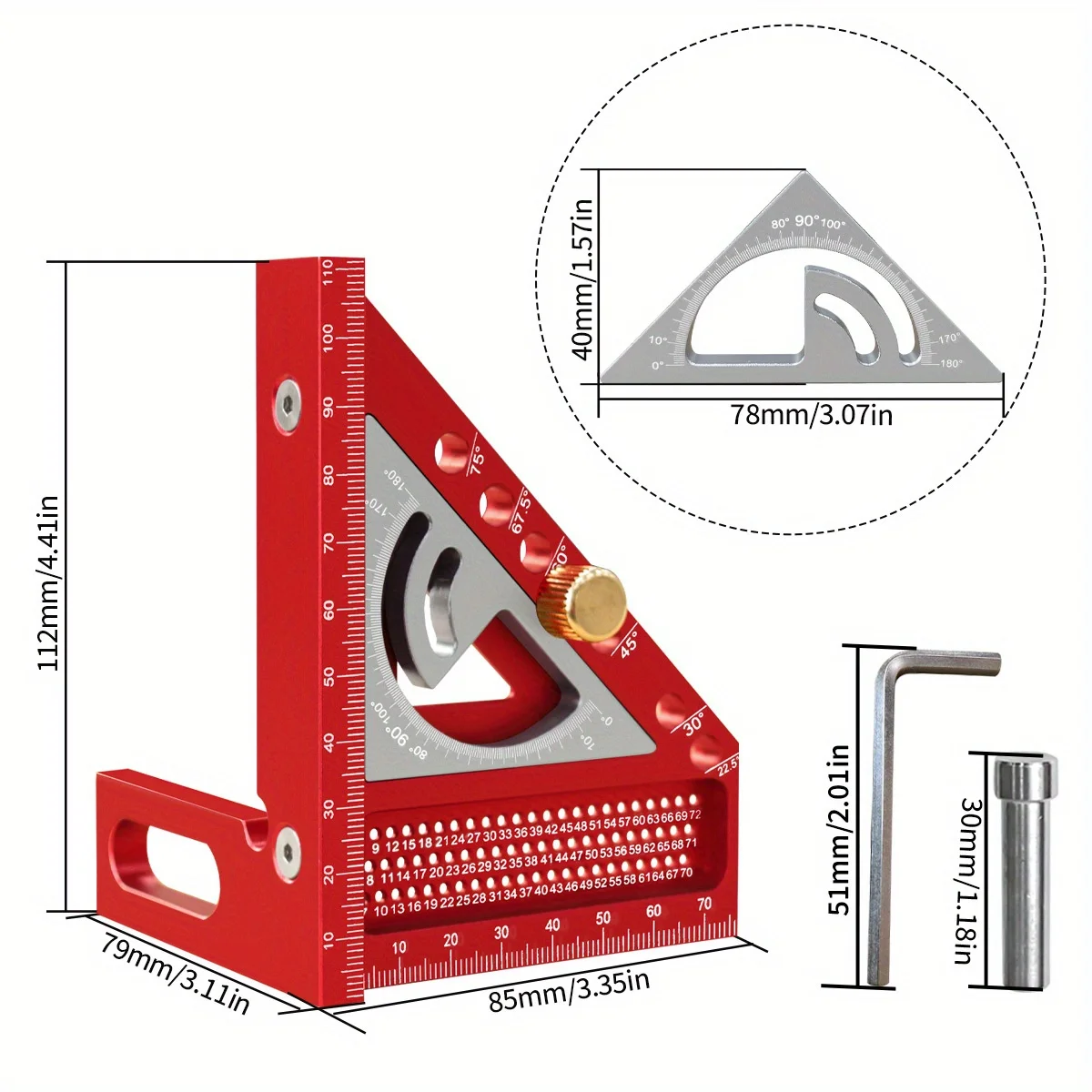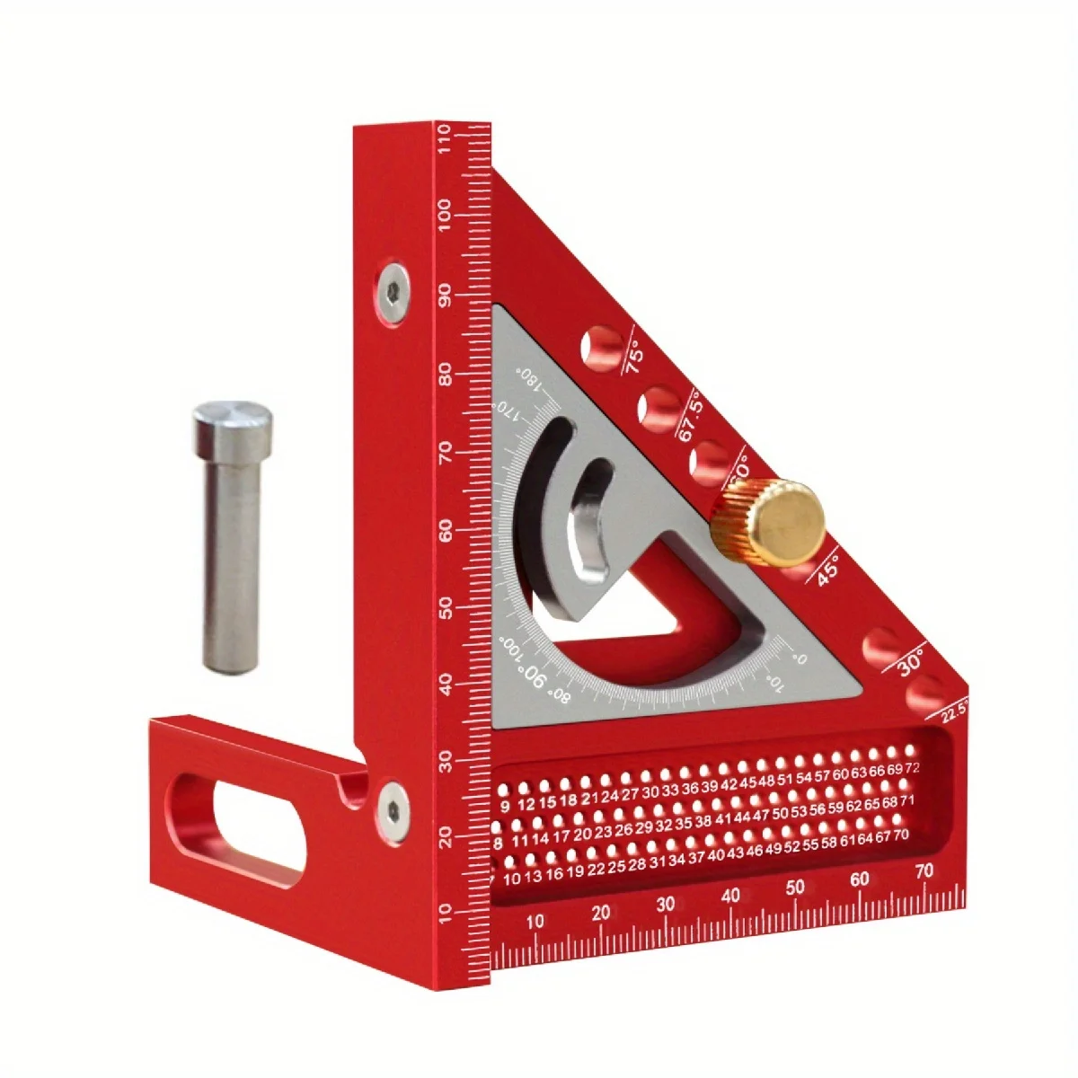 Transportador cuadrado de carpintería multiángulo 3D con regla triangular pequeña con pasador de posicionamiento de ángulo y agujero de trazado cuadrado en T